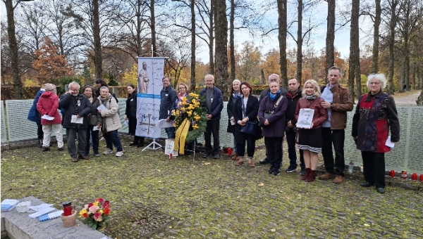 Foto: Gebet an Allerheiligen 2023 am Gedenkort im Ehrenhain I des Friedhof Perlacher Forst, München. Rechte beim Verein Selige Märtyrer e.V.