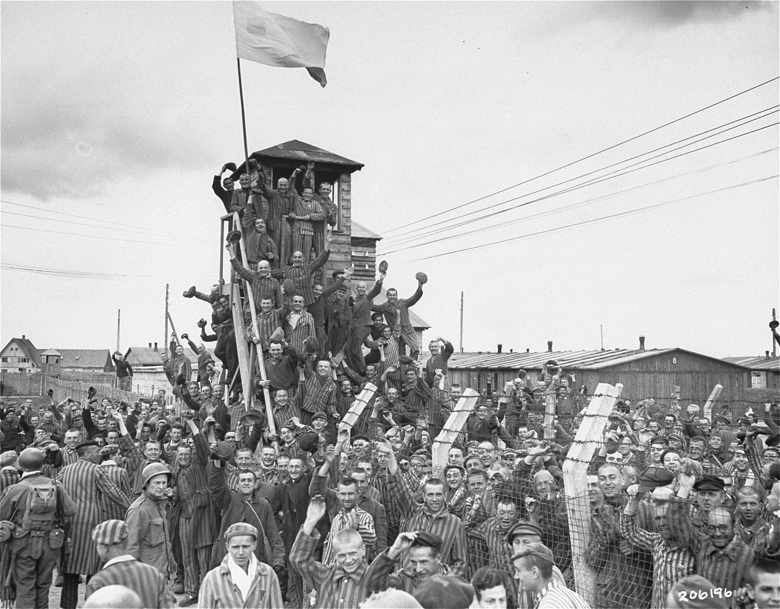 Foto: Der KZ-Außenlagerkomplex München-Allach, in dem Henk Sietsma vom 22. Dezember 1944 bis zur Befreiung am 30. April 1945 inhaftiert war. Foto:openstreetmap.org, CC BY-SA 2.0; Häftlinge des KZ-Außenlagers Allach jubeln über die Befreiung durch die US-Armee. Foto: Sydney Blau, Public Domain