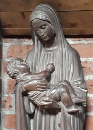 Die Statue stammt aus der Kapelle des Priesterblocks im Block Nr. 26 des KZ Dachau, wie man an der Tafel unter der Figur lesen kann. Verwundert können wir uns fragen: Im KZ, in dem Geistliche gefangenen waren und aus Glaubenshass ermordet wurden, war eine Madonnenstatue?