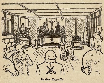 „Das Konzentrationslager war in den letzten Monaten des Bestehens, ab Jan. 1945, mit Häftlingen überfüllt. Waren 1941, bei Errichtung der Kapelle, 5000 Häftlinge eingesperrt, betrug die Zahl 1945 über 30.000, die auf engstem Raum leben mussten. Auch in der Kapelle waren 100 Personen untergebracht. Deshalb teilte man den Raum durch einen großen Vorhang. Die eine Hälfte war für die Kapelle reserviert, die andere Hälfte war während des Tages Arbeitsraum (dort wurden Zeltbahnen genäht) und nachts Schlafplatz für die Priester in Decken auf dem bloßen Fußboden.“[37] So hielten sich nahezu immer Geistliche in der Barackenkapelle auf und beteten beim Arbeiten und sozusagen auch beim Schlafen.
