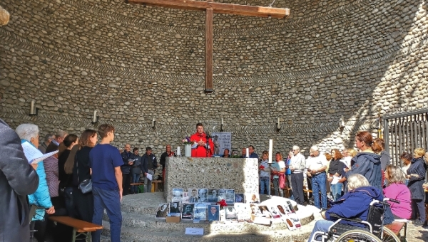 Foto: Gebet an Allerheiligen 2023 am Gedenkort im Ehrenhain I des Friedhof Perlacher Forst, München. Rechte beim Verein Selige Märtyrer e.V.