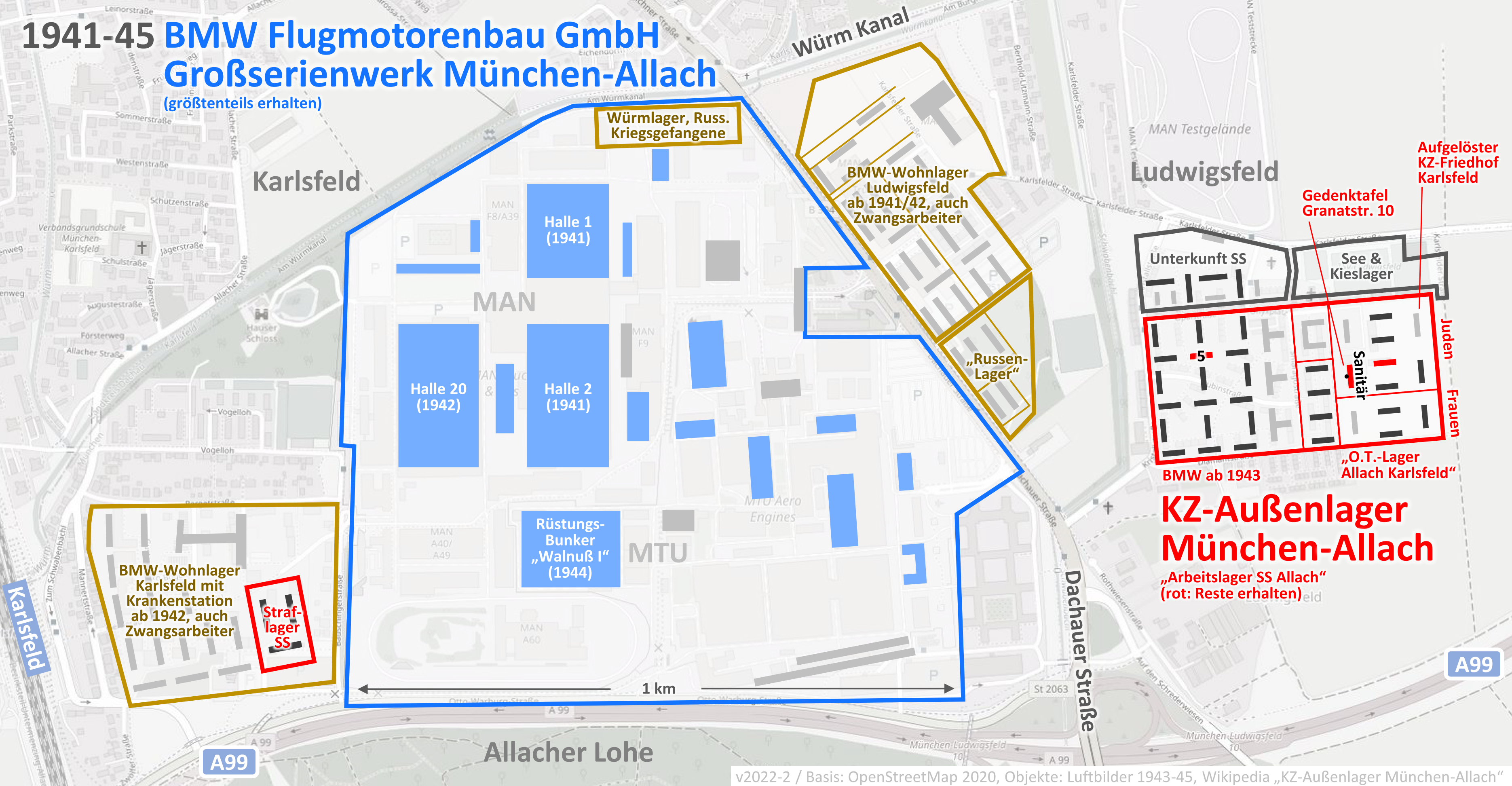 Im Außenlagerkomlex München-Allach mussten gegen Kriegsende rund 17.000 KZ-Häftlinge, Zwangsarbeiter und Kriegsgefangene für das Großserienwerk München-Allach der BMW-Flugmotorenbau GmbH auf rund 80 Hektar Fläche Motoren für Kampfflugzeuge zusammenbauen. Das Gelände liegt heute im Gewerbegebiet MAN/MTU. Außerdem besaß der Komplex damals zwei Wohnlager von BMW, von denen eins auch für Zwangsarbeiter genutzt wurde, ein Lager für russische Kriegsgefangene, ein weiteres „Russenlager“, ein Lager der Organisation Todt, getrennt in Bereiche für Juden und Frauen sowie das KZ-Außenlager selbst mit einem Unterkunftsbereich für die SS.