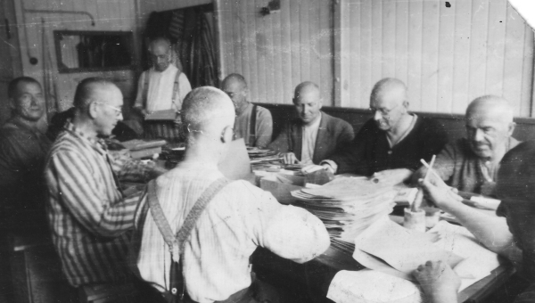 Pater Konrad Just (rechts hinter dem Tisch) beim Kommando, das Tüten kleben musste.