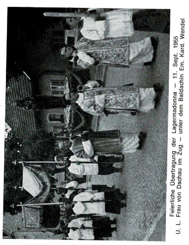 Anlässlich eines großen Treffens von im KZ gefangenen Geistlichen in Dachau am 11.09.1955 wurde ein Dankgottesdienst in St. Jakob, Dachau, gefeiert. Anschließend wurde Unsere Liebe Frau von Dachau in einer feierlichen Prozession unter Anwesenheit vieler überlebender Geistlicher in die Stadtpfarrkirche St. Jakob überführt. Tausende Dachauer Bürger säumten dabei die Straßen der Dachauer Altstadt. [61]